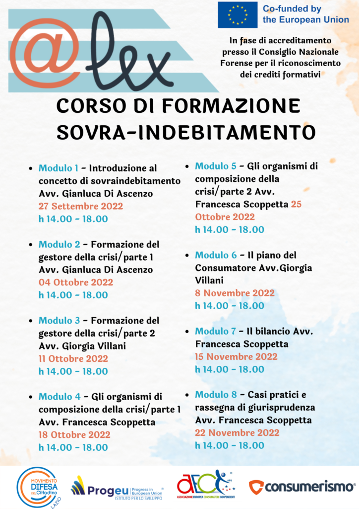 Il programma prevede a partire dal prossimo 27 settembre 8 sessioni della durata di 4 ore ciascuno, tenuti da primari avvocati esperti della tutela del consumatore e del sovraindebitamento tra cui Gianluca Di Ascenzo (presidente Codacons), L’Avv.to Giorgia Villani (Fondatrice del primario studio legale NAZZARO – VILLANI) e l’Avv.to Francesca Scoppetta (fondatrice dell’associazione PRODEITALIA).