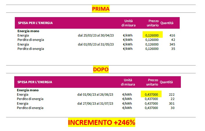 Qui un esempio concreto della variazione dei prezzi senza aver ricevuto nessun preavviso di un consumatore: