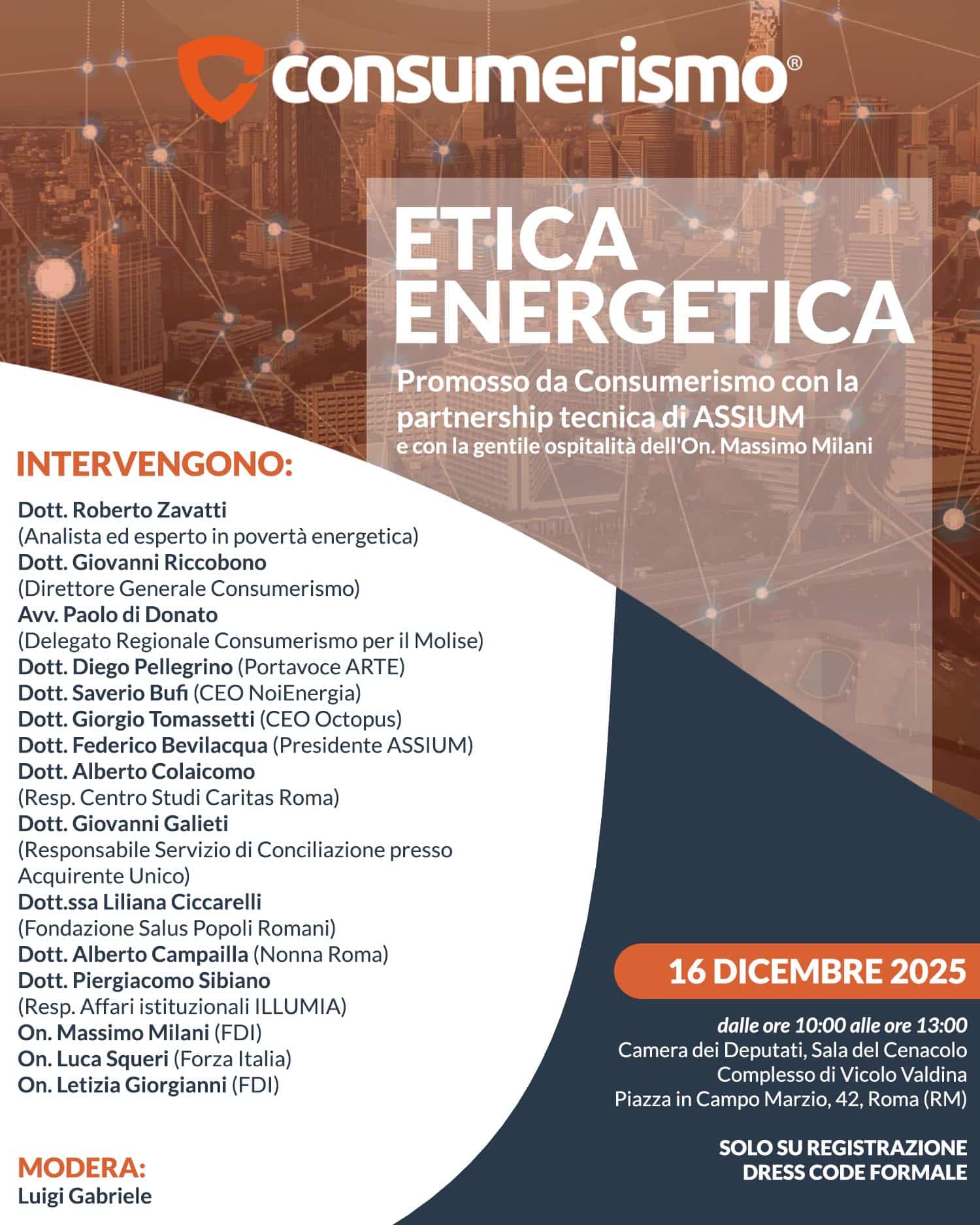 Il convegno vedrà la partecipazione di analisti, giuristi, operatori del settore, associazioni, rappresentanti del terzo settore e istituzioni. Tra gli interventi previsti: Roberto Zavatti, analista ed esperto in povertà energetica; Giovanni Riccobono, Direttore Generale Consumerismo; Paolo Di Donato, Avvocato e Coordinatore del Tavolo Tecnico “Etica Energetica”; Diego Pellegrino (ARTE); Saverio Bufi (NoiEnergia); Giorgio Tomassetti (Octopus Energy); Federico Bevilacqua (ASSIUM); Alberto Colaicomo (Caritas Roma); Giovanni Galieti (Acquirente Unico – Servizio Conciliazione); Liliana Ciccarelli (Fondazione Salus Popoli Romani); Alberto Campailla (Nonna Roma); oltre a rappresentanti istituzionali e del mondo politico.