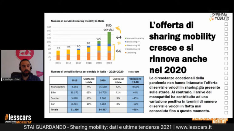 Raimondo Orsini, coordinatore dell’osservatorio Nazionale Sharing Mobility dichiara, “stiamo constatando sempre più che è ormai in atto un nuovo paradigma nelle nostre città, a cui abbiamo dato il nome di ‘Muoversi con leggerezza’, vale a dire la tendenza dei servizi di sharing ad utilizzare veicoli sempre meno ingombranti e leggeri, in controtendenza al gigantismo dei veicoli di proprietà. Più condivisione, meno peso, meno spazio occupato” infatti, secondo i dati dell’Osservatorio il peso medio del veicolo condiviso in Italia si è ridotto di circa un quarto nell’arco di 5 anni passando da circa 400 kg ai 120 kg attuali. Il 90% del totale dei veicoli in sharing presenti in Italia è costituito da biciclette, scooter e monopattini, che rappresentano 9 noleggi su 10 ed il 50% delle percorrenze totali in sharing.