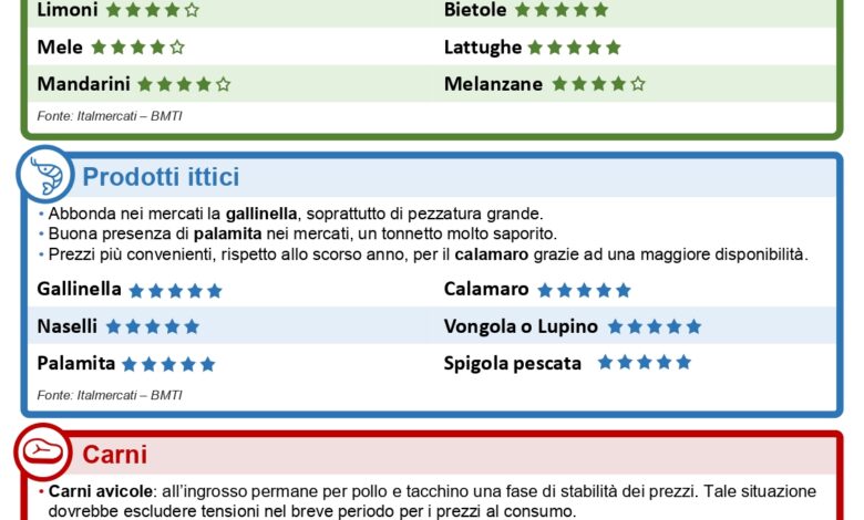 Roma, 9 febbraio 2024 – Si allarga La Borsa della Spesa, il servizio rivolto interamente ai consumatori, realizzato da BMTI e Italmercati, in collaborazione con Consumerismo No Profit. Da oggi, infatti, il servizio non includerà più solo il comparto ortofrutticolo ma darà indicazioni utili anche per quanto riguarda il comparto ittico, le carni e gli altri comparti del settore agroalimentare (olio di oliva, formaggi, cereali). L’obiettivo resta quello di fornire ai consumatori preziose indicazioni per fare la spesa in maniera facile e consapevole, facendo chiarezza sulle dinamiche di mercato, partendo dai prezzi all’ingrosso e scegliendo prodotti convenienti, in termini di rapporto qualità-prezzo dei prodotti e sostenibili, considerando l’attenzione rivolta anche all’ambiente trattandosi di prodotti stagionali e locali.