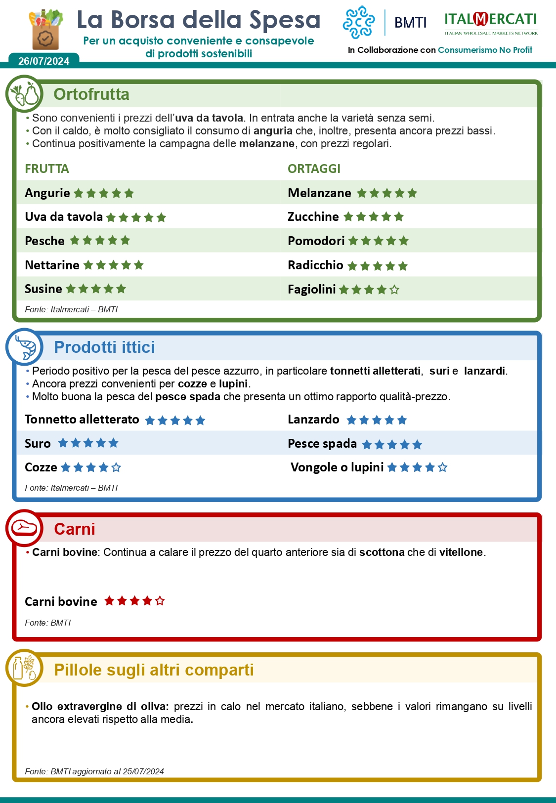 Roma, 26 luglio 2024 – La sostenibilità e la presenza di un ottimo rapporto qualità-prezzo sono i pilastri dei consigli de La Borsa della Spesa di questa settimana, il servizio di BMTI e Italmercati Rete di Imprese con la collaborazione di Consumerismo No Profit. Nonostante il timore che il forte caldo possa impattare negativamente su alcune produzioni tipiche di questo periodo, sono tanti i prodotti che ancora si difendono bene, conservando la loro qualità e il loro giusto prezzo, in alcuni casi anche al di sotto della media del periodo.
