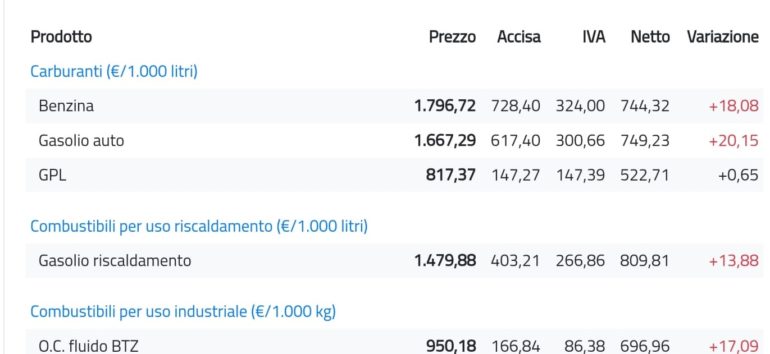 “Siamo in presenza di una vera e propria emergenza, perché gli incrementi dei listini dei carburanti hanno effetti negativi sull’intero sistema economico – spiega il presidente Furio Truzzi – Oltre ad aggravare la spesa degli italiani per i rifornimenti, il caro-benzina determina maggiori costi in capo a industrie e imprese, causa aumenti dei prezzi al dettaglio e ha ripercussioni sull’inflazione”.