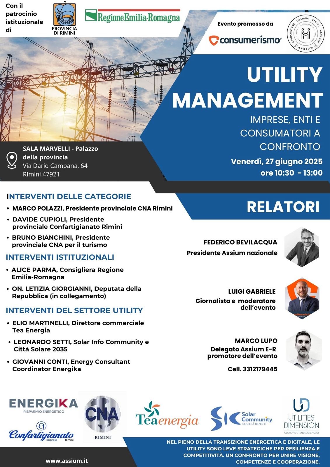 Diverse le figure di rilievo che si alterneranno sul palco, dal presidente di CNA Rimini Marco Polazzi a quello di Confartigianato Davide Cupioli, dalla consigliera regionale Alice Parma fino a Leonardo Setti, responsabile del progetto Città Solare 2035. Interverrà in collegamento l’onorevole Letizia Giorgianni, promotrice dell’emendamento che qualche mese fa in Parlamento ha ufficialmente istituito la figura del nuovo consulente per le utenze, l’utility manager, che ad aprile è stato inserito nel Decreto Bollette varato dal Governo. Sul tavolo anche il parere di esperti del settore utility come Elio Martinelli(direttore Commerciale Tea Energia) e Giovanni Conti (energy consultant coordinator Energika). A moderare l’incontro sarà il noto giornalista Luigi Gabriele.