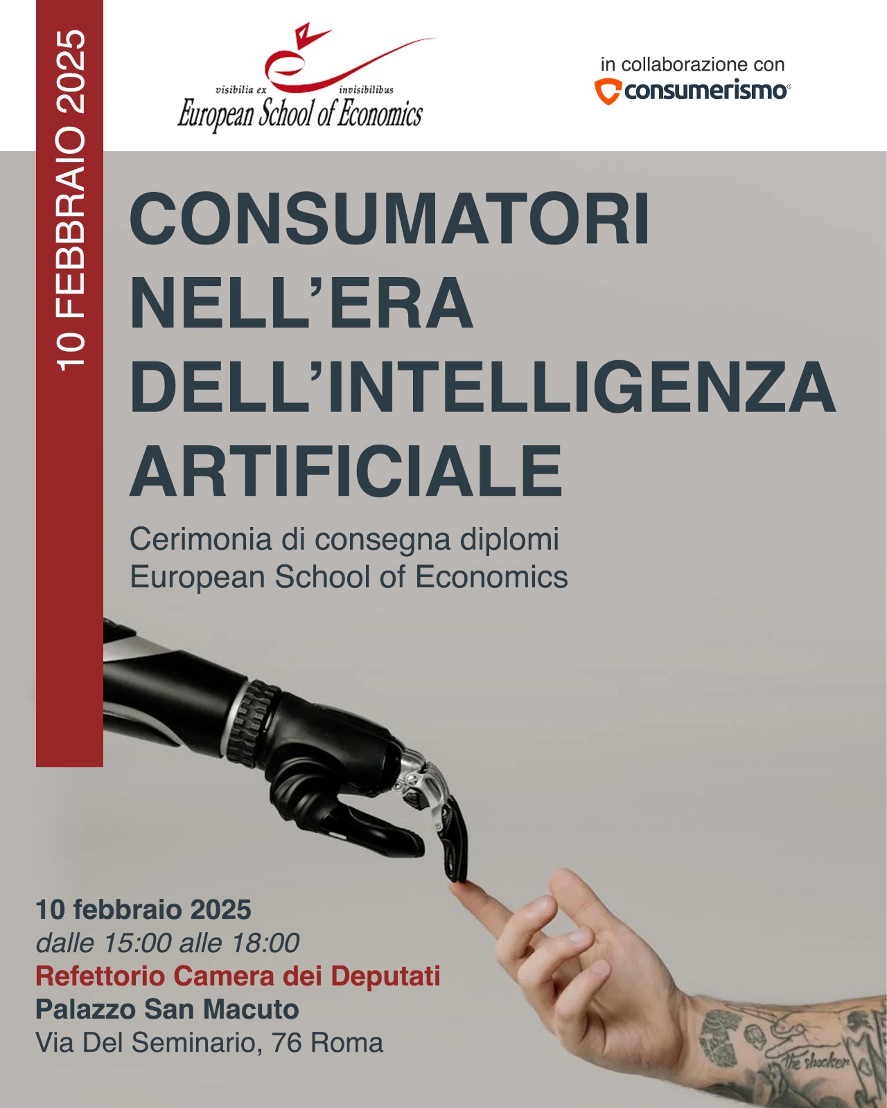 L’incontro “Consumatori nell’era dell’intelligenza artificiale”, che si terrà il prossimo 10 febbraio presso il Refettorio Camera dei Deputati – Palazzo San Macuto (Roma), organizzato da European School of Economics in collaborazione con l’associazione dei consumatori Consumerismo presenterà un focus sul ruolo del consumatore in un’era dominata dalla tecnologia.