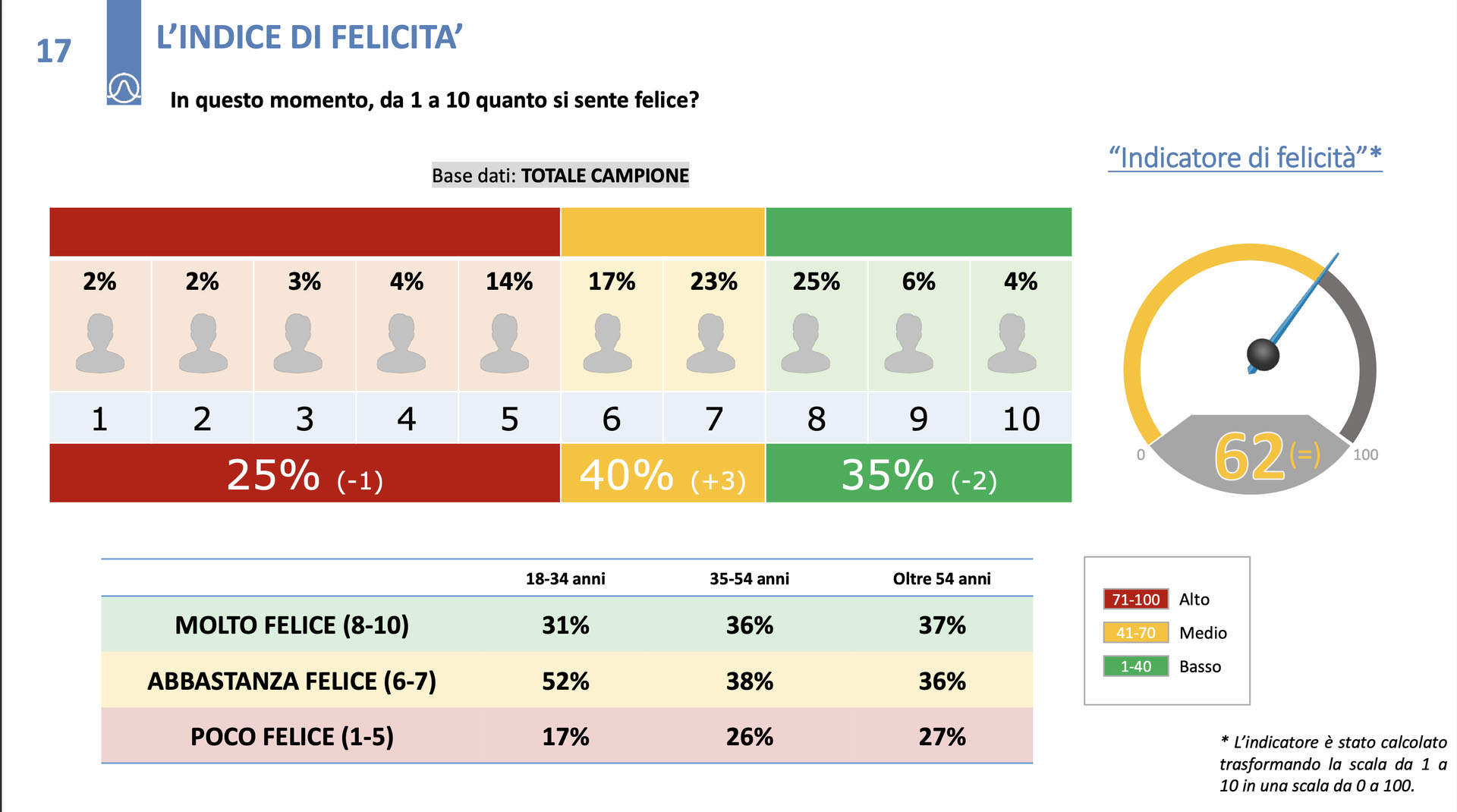 A livello complessivo, il punteggio medio dell’indice di felicità è di 62 su 100. Tuttavia, si osservano segnali di fragilità crescente, in particolare fra i più giovani (18-34 anni), tra i quali solo il 31% si dichiara “molto felice”, contro il 37% degli over 54.