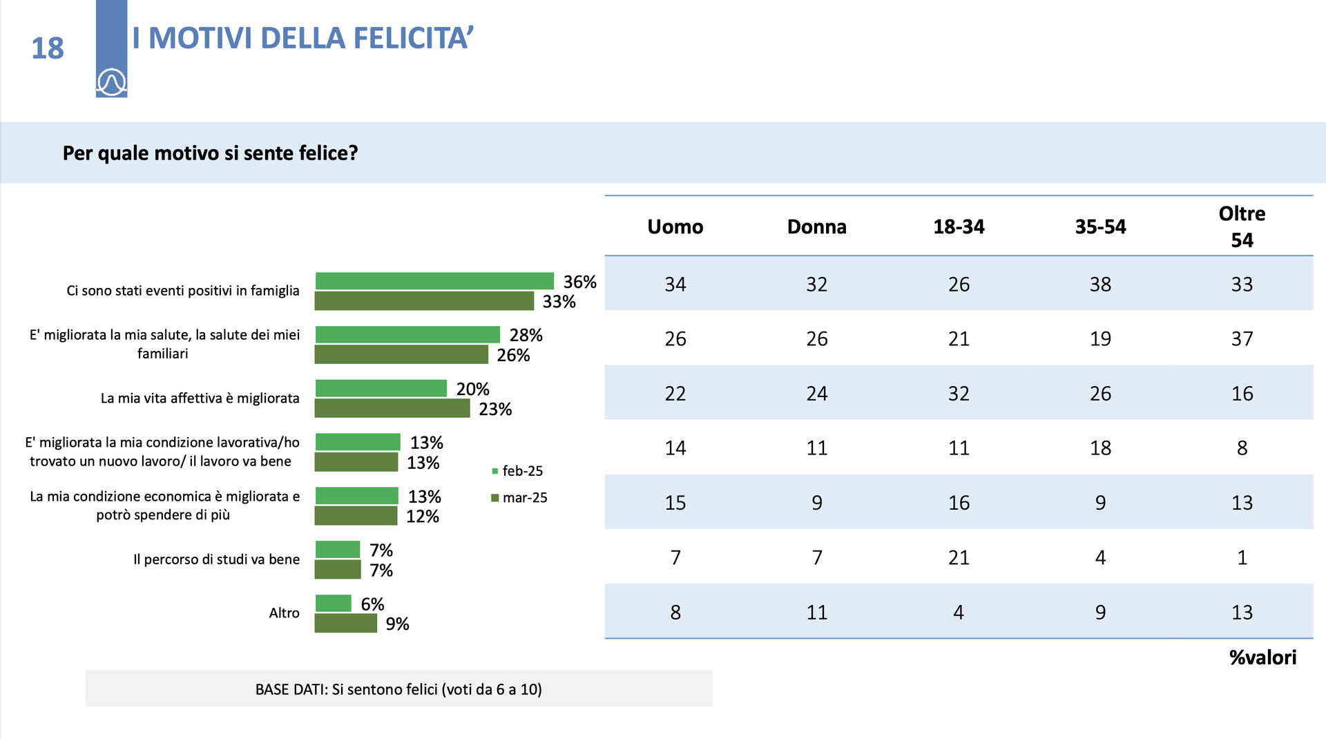 Sul fronte opposto, aumenta nettamente il peso delle condizioni economiche tra i motivi di infelicità: il 39% di chi si dichiara infelice segnala un peggioramento economico come causa principale, in netto aumento rispetto al 24% di febbraio. Tra le motivazioni, diminuiscono i problemi di salute (dal 36% al 26%), ma aumentano quelli lavorativi (dal 13% al 19%), gli eventi negativi in famiglia (+4%) e la propria vita affettiva (+8%).