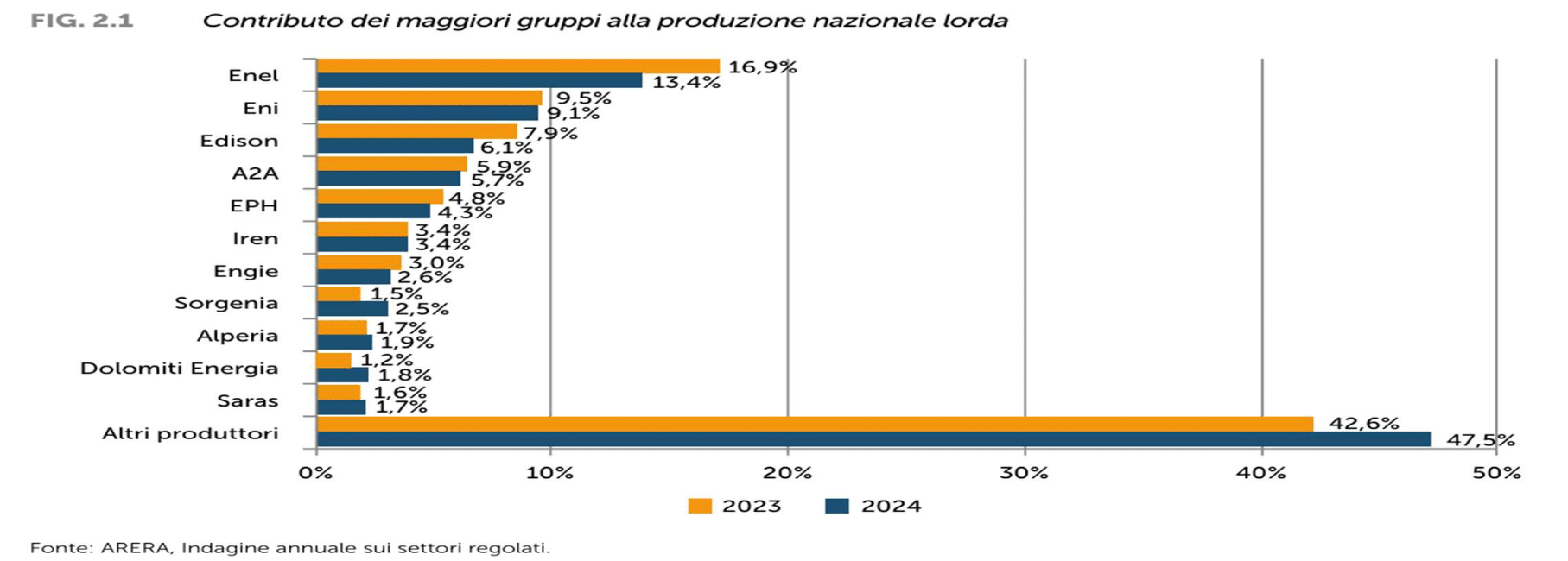 Nel 2021 infatti, Enel si confermava ancora il principale produttore di elettricità in Italia, staccando tutti con una quota del 37,5%, mentre ENI e EDISON godevano di un secondo posto con il 4,5% e A2A veniva segnalato come “operatore rilevante”.