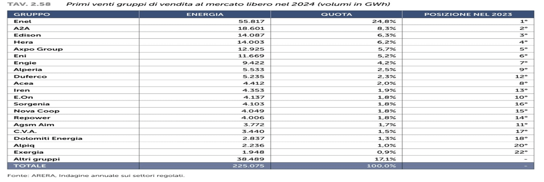 Tuttavia, anche nell’ultima Relazione dell’Autorità di Regolazione per Energia Reti e Ambiente (ARERA), i dati evidenziano una forte concentrazione nella produzione di energia elettrica da parte dei principali venditori, nonostante il DL CACER abbia significativamente accelerato la crescita diffusa dei piccoli produttori.