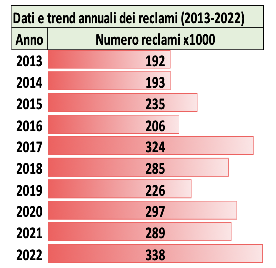 - 2020-2022: il trend torna a crescere, fino a 337.863 reclami nel 2022, il valore più alto dell’ultimo decennio. L’aumento ulteriore è chiaramente influenzato dall’esplosione della crisi energetica europea e dalle nuove pratiche commerciali sempre più aggressive, oltre che da un mercato libero percepito dai Consumatori come meno tutelante e più difficile da gestire.