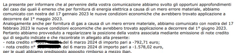A seguito delle contestazioni, dove si richiedeva il ricalcolo, nonché il rimborso del surplus di spesa generato (circa 2000€), la società ha accolto il reclamo emettendo due nota di credito per un totale di 2370€.