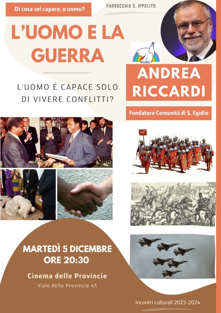Nell’ambito del ciclo di incontri “Di cosa sei capace, o uomo?”, il prossimo 5 dicembre 2023 la Parrocchia di Sant’Ippolito ospiterà presso il Cinema delle Province il fondatore della Comunità di Sant’Egidio, prof. Andrea Riccardi.