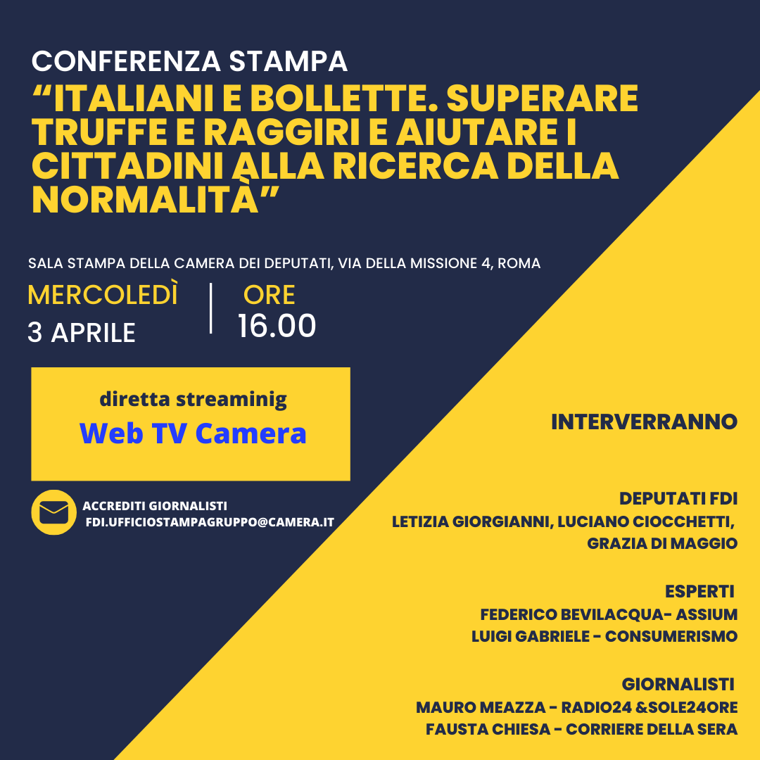 Si terrà mercoledì 3 aprile alle ore 16 nella sala stampa della Camera dei Deputati (via della Missione 4) la conferenza stampa dal titolo “Italiani e Bollette. Superare truffe e raggiri e aiutare i cittadini alla ricerca della normalità”.