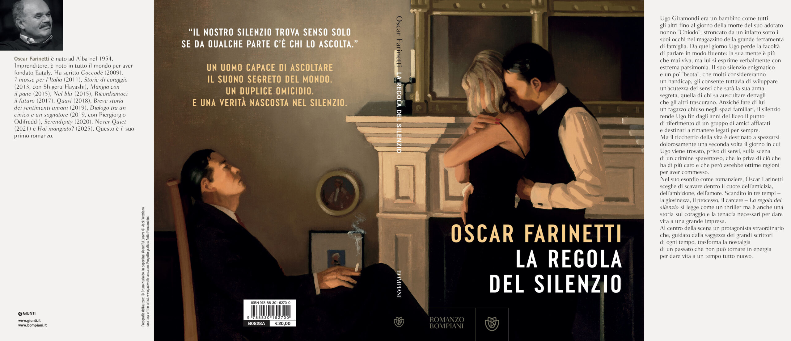 Da quel giorno Ugo perde la facoltà di parlare in modo fluente: la sua mente è più che mai viva, ma lui si esprime verbalmente con estrema parsimonia. Il suo silenzio enigmatico e un po’ “beota”, che molti considereranno un handicap, gli consente tuttavia di sviluppare un’acutezza dei sensi che sarà la sua arma segreta, quella di chi sa auscultare dettagli che gli altri trascurano. Anziché fare di lui un ragazzo chiuso negli spazi familiari, il silenzio rende Ugo fin dagli anni del liceo il punto di riferimento di un gruppo di amici affiatati e destinati a rimanere legati per sempre. Ma il ticchettio della vita è destinato a spezzarsi dolorosamente una seconda volta il giorno in cui Ugo viene trovato, privo di sensi, sulla scena di un crimine spaventoso, che lo priva di ciò che ha di più caro e che però avrebbe ottime ragioni per aver commesso. Nel suo esordio come romanziere, Oscar Farinetti sceglie di scavare dentro il cuore dell’amicizia, dell’ambizione, dell’amore. Scandito in tre tempi – la giovinezza, il processo, il carcere – La regola del silenzio si legge come un thriller ma è anche una storia sul coraggio e la tenacia necessari per dare vita a una grande impresa. Al centro della scena un protagonista straordinario che, guidato dalla saggezza dei grandi scrittori di ogni tempo, trasforma la nostalgia di un passato che non può tornare in energia per dare vita a un tempo tutto nuovo.