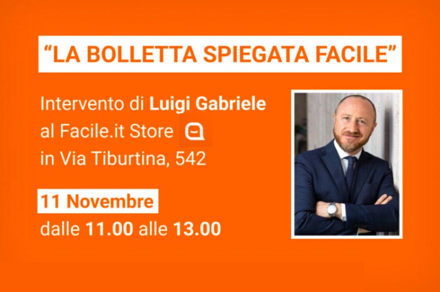 Luigi Gabriele – Presidente di Consumerismo – l’11 novembre sarà al Facile.it store di Via Tiburtina 542 per farti scoprire tutti i segreti che nasconde la tua bolletta e capire cosa fare per essere preparati alla fine del mercato tutelato.