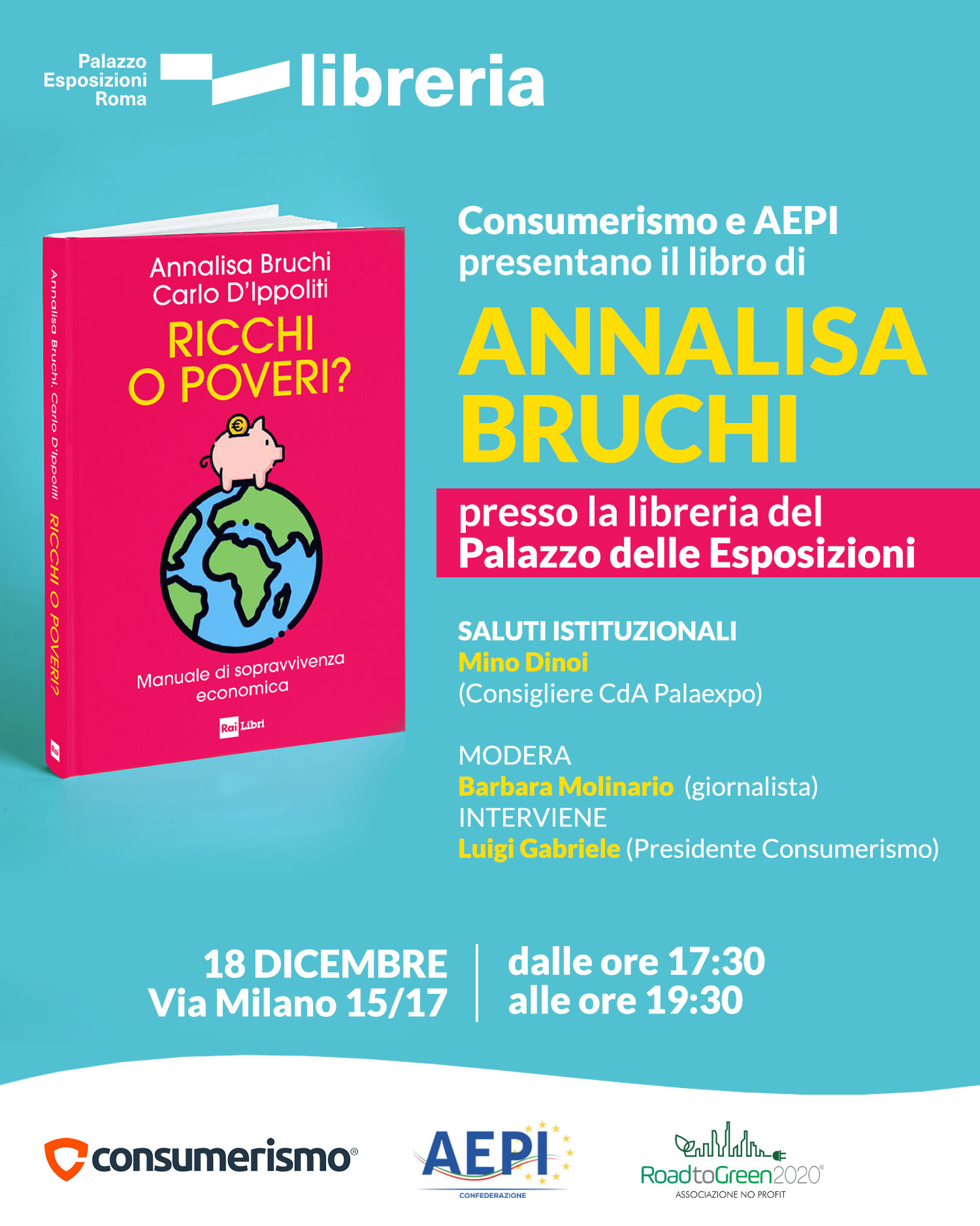La presentazione del nuovo libro della giornalista Annalisa Bruchi “Ricchi o poveri?” rappresenta un’occasione per incontrarsi in uno dei luoghi più iconici della Capitale. Il 18 dicembre, nella splendida cornice del Palazzo delle Esposizioni in via Milano 15/17, Consumerismo, Confederazione AEPI e Road to green 2020 accoglieranno il pubblico in uno spazio storico e suggestivo che custodisce al suo interno una libreria considerata un piccolo gioiello della città, un luogo capace di unire cultura, bellezza e partecipazione.