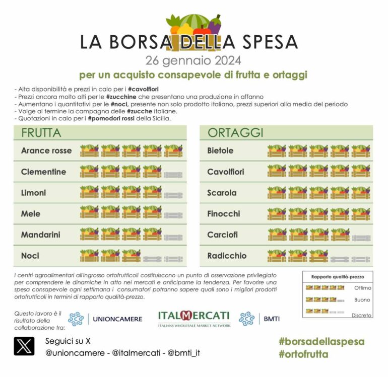 Buoni e di stagione i prodotti presenti nella “Borsa della Spesa” di questa settimana, il servizio che BMTI (Borsa Merci Telematica Italiana), insieme ad Italmercati Rete di imprese, realizza settimanalmente per guidare le famiglie italiane, anche grazie al contributo di Consumerismo No Profit, verso acquisti convenienti, consapevoli e sostenibili, sia per l’ambiente che per la loro salute.