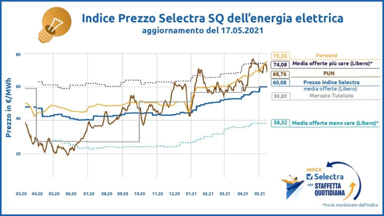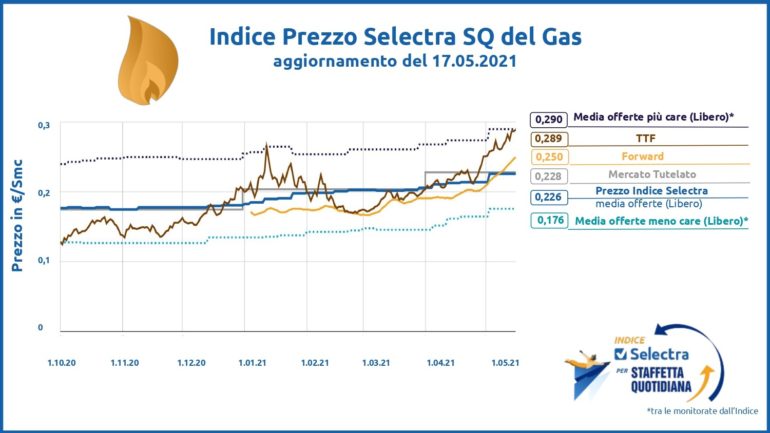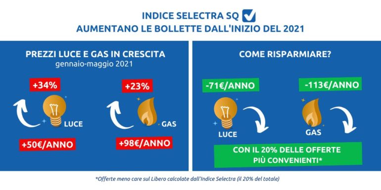 Questa primavera è arrivata un’impennata inaspettata dei prezzi della luce e del gas. I prezzi dell’energia, dopo il crollo di un anno fa dovuto alla pandemia, hanno cominciato una crescita graduale a partire dall’autunno del 2020. Dall’inizio del 2021 poi si è assistito ad un aumento della media delle offerte luce per le famiglie del 34% e del 23% per quelle del gas. È quanto si evince dai dati di Indice Selectra SQ, l’osservatorio permanente del Mercato Libero dell’energia elettrica e del gas, realizzato da Selectra (selectra.net), il servizio gratuito che aiuta i consumatori a mettere a confronto e ad attivare le offerte di Luce, Gas e Internet.