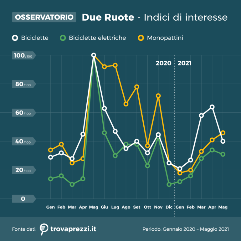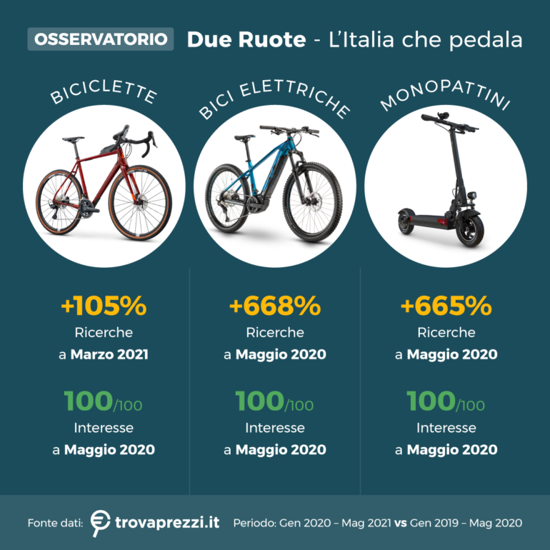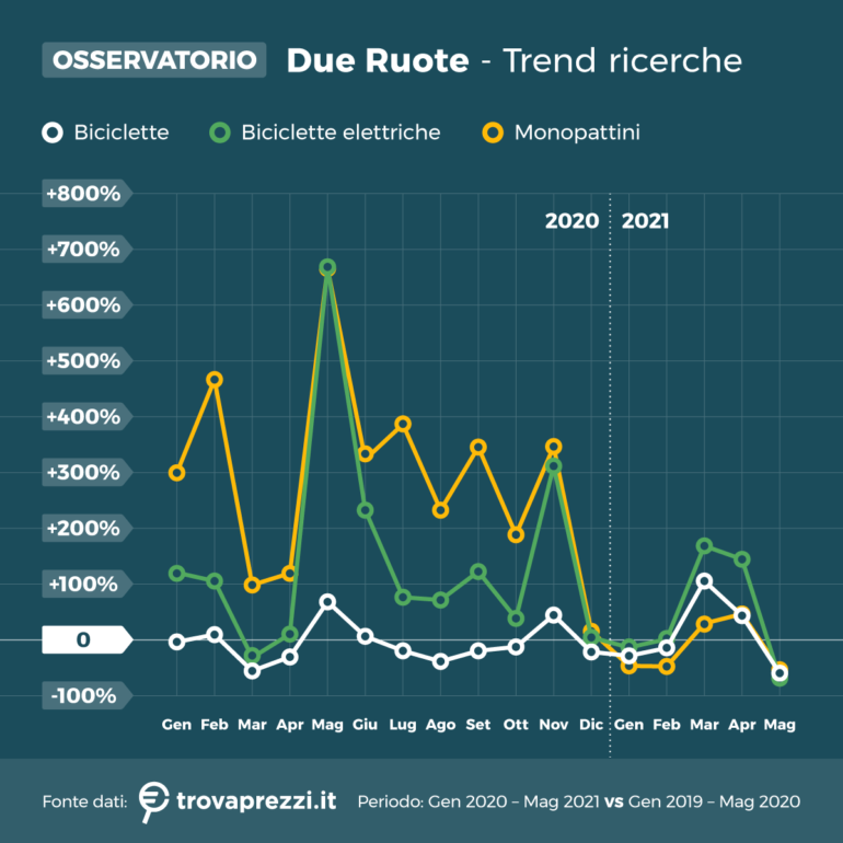 Su Trovaprezzi.it la ricerca di monopattini ha registrato un aumento del 665% nel mese di maggio 2020 (rispetto al maggio 2019) e del 466% nel mese di febbraio, con una crescita elevata durante tutto il 2020. Stesso trend per la categoria Biciclette Elettriche, che ha visto l’impennata maggiore a maggio 2020 (+668%) e nel mese di novembre (+311%). Di contro, la categoria Biciclette ha mostrato un andamento altalenante durante il periodo preso in esame. Da quanto è emerso, infatti, gli italiani hanno preferito mezzi di trasporto elettrici, acquistando una bici a pedalata assistita e sfruttando così gli incentivi previsti dal bonus mobilità messi a disposizione dal Governo.