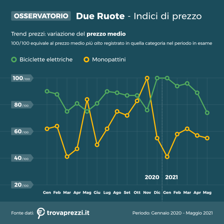 Quando è più conveniente acquistare questi prodotti? Analizzando il prezzo medio mensile delle biciclette elettriche emerge un calo nei mesi di marzo, maggio e novembre 2020 ma il minimo è stato raggiunto nel mese di maggio 2021. Per i monopattini, invece, l’indice di prezzo è stato più altalenante (il minimo è stato raggiunto a marzo 2020 e a gennaio 2021).