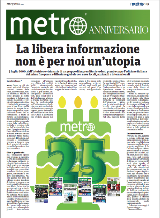 Il primo free press al mondo in diffusione globale continua a distribuire copie gratuite nelle città di Roma, Milano, Torino, Firenze, Bologna e Perugia, con i suoi contenuti editoriali caratterizzanti: autorevolezza, certezza delle fonti, notizie essenziali. In una edizione speciale dedicata all’evento/anniversario, il direttore Salvatore Puzzo ricorda le difficoltà sopportate per introdurre il free press in Italia per scardinare un establishment vetusto, dichiaratosi sin dall’inizio ostile alla nascita e alla crescita di un giornale gratuito.