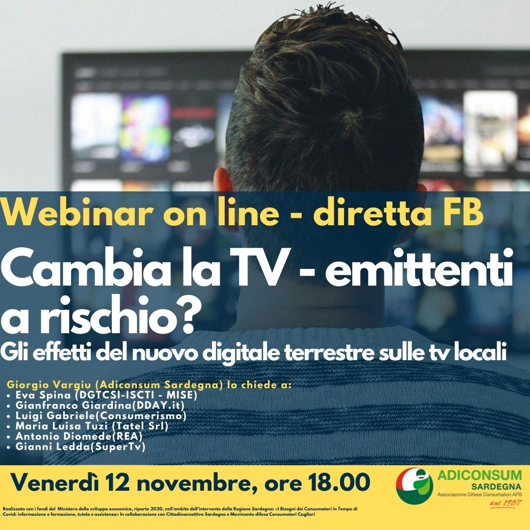 Proprio per approfondire le conseguenze del passaggio al nuovo digitale terrestre Adiconsum Sardegna ha organizzato per il prossimo 12 Novembre 2021 un webinar che si terrà alle ore 18.00 sulla pagina Facebook dell’associazione (https://www.facebook.com/AdiconsumSardegna), nel corso del quale si affronteranno tutti i temi connessi al passaggio al nuovo digitale terrestre e gli effetti di tale cambiamento sui consumatori e sugli operatori dell’informazione, i costi dell’operazione e le conseguenze sociali derivanti dal restringimento del diritto all’informazione e al pluralismo radiotelevisivo.